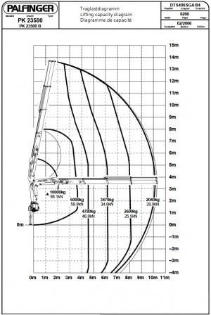 Гидравлический кран из тяжелой серии Palfinger. Благодаря конструкции манипулятора позволяет доставлять грузы в труднодоступные места и поднимать груз непосредственно под собой. В конструкции используется шестигранный профиль стрелы австрийского производства.